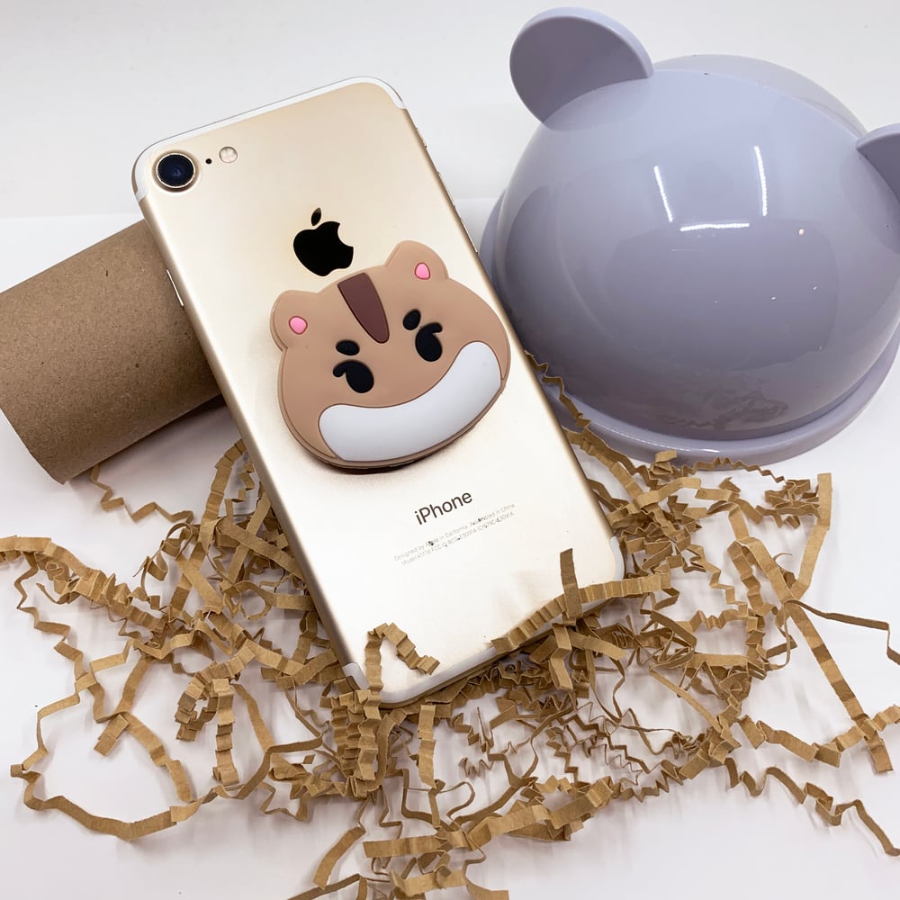 This hamjin phone pop is 2" wide and made of silicone for a soft touch, with a plastic accordion-style base that extends up to 1". Works as a phone grip and a stand for your phone. Attaches to any phone case with a strong adhesive backing.