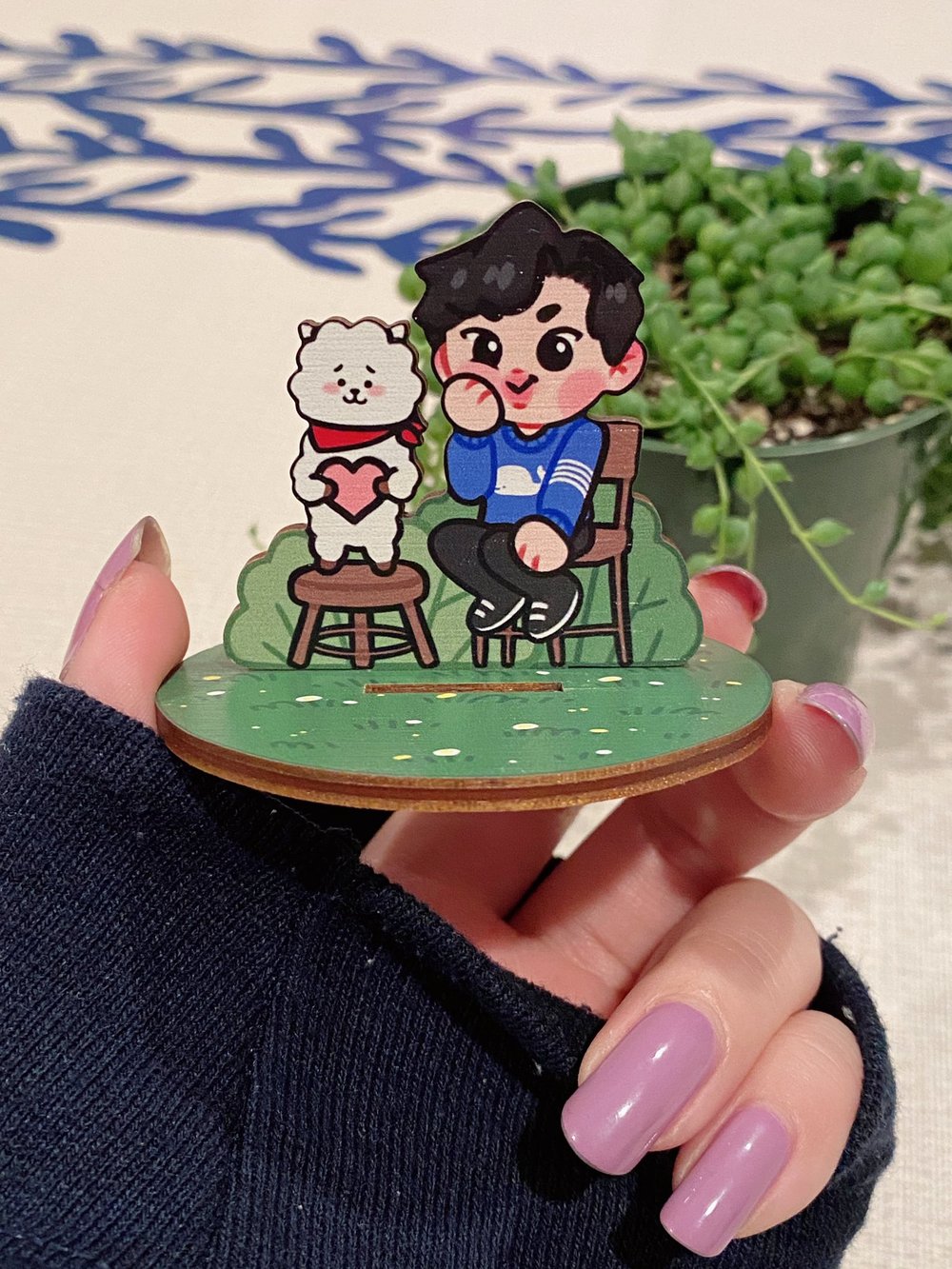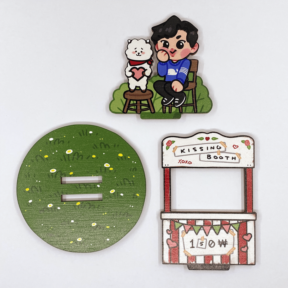 6.5cm (2.5in) 3-part wooden standee featuring Seokjin and RJ behind the kissing booth! Parts come with protective paper lining and may have a bit of a burnt wood smell to them when first opened. Originally designed for the King of Hearts Zine as a stretch goal!